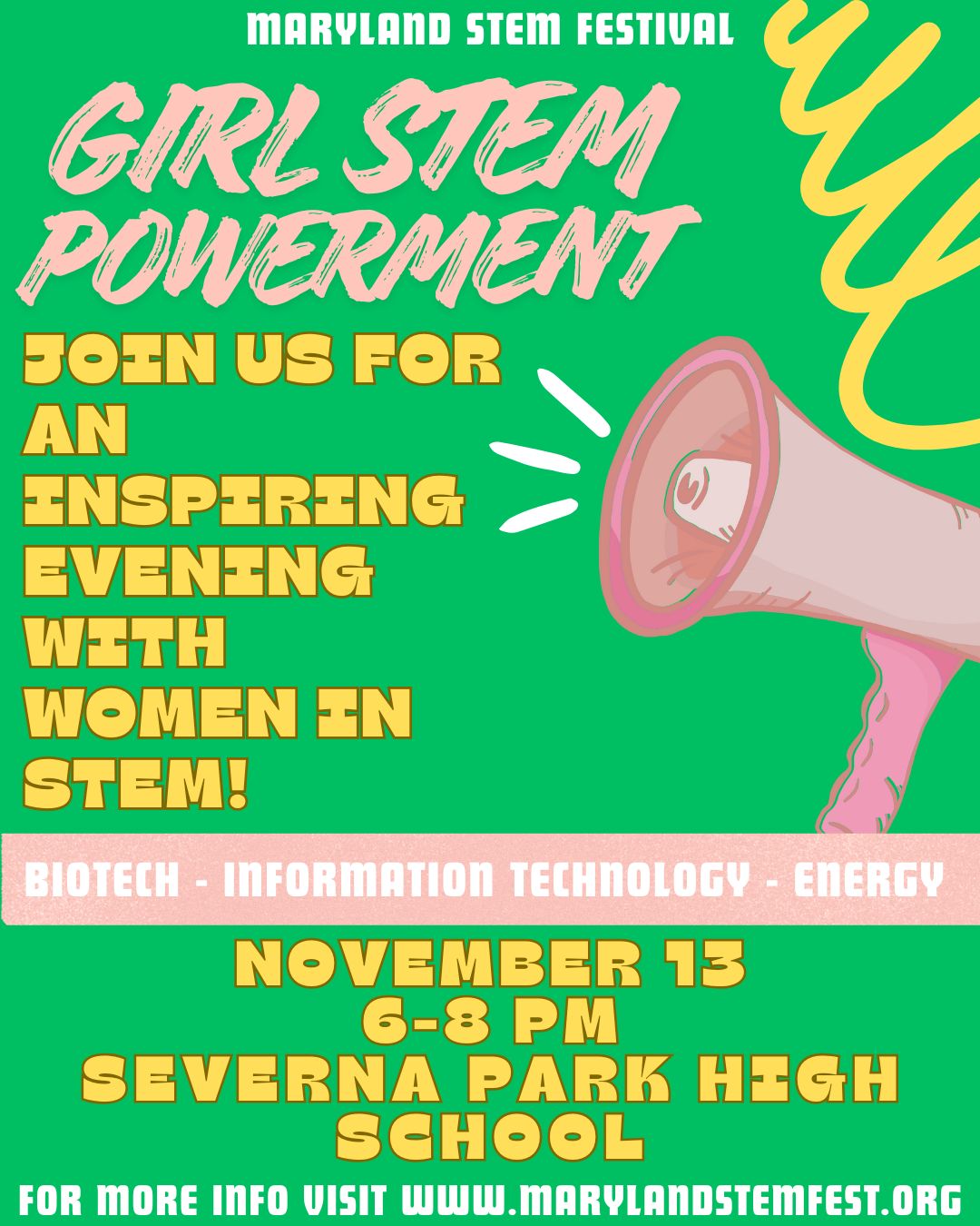 Hi. The Maryland STEM Festival holing our Girl STEM Powerment event on November 13th at Severna Park High School from 6:00-8:00 p.m. Join us for an evening with Women STEM professionals and educators as they discuss their fields and careers. Fields such as biotech, Information Technology, Energy, Engineering, and more will be highlighted. Participants include AstraZeneca, Whiting-Turner, UMBC, the Society of Women Engineers, and others.