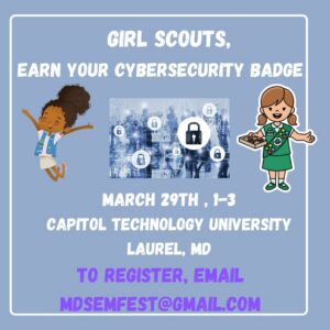 Due to the success of last year’s events, we are holding our FREE Girl Scouts Cybersecurity Badge event on March 29th at Capitol Technology University from 1-3 pm. Daisies, Brownies, Juniors, and Cadets will work with women STEM Professionals to learn about Cybersecurity and earn their badges. We will provide certificates of completion so they can get their Cybersecurity Badge. There will be light snacks. Space is limited, so register by emailing mdstemfests@gmail.com. Don’t miss this unique, fun event to celebrate Women’s History Month.